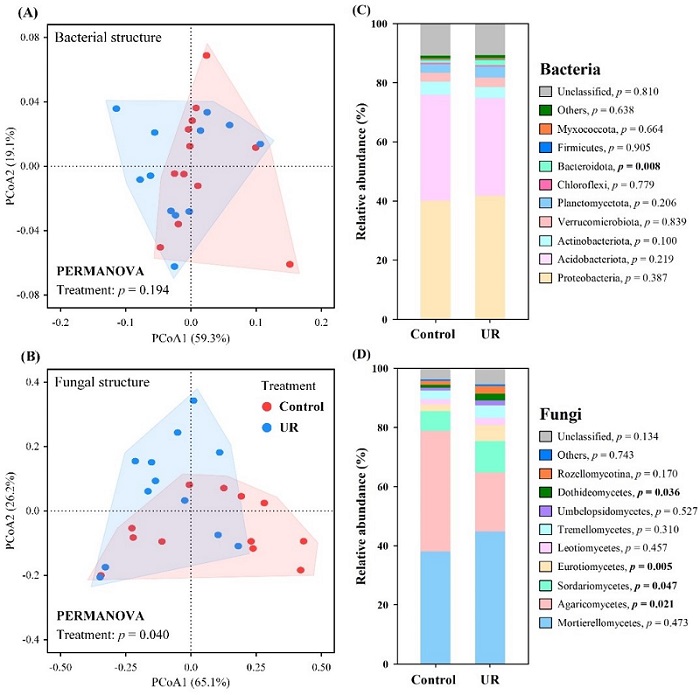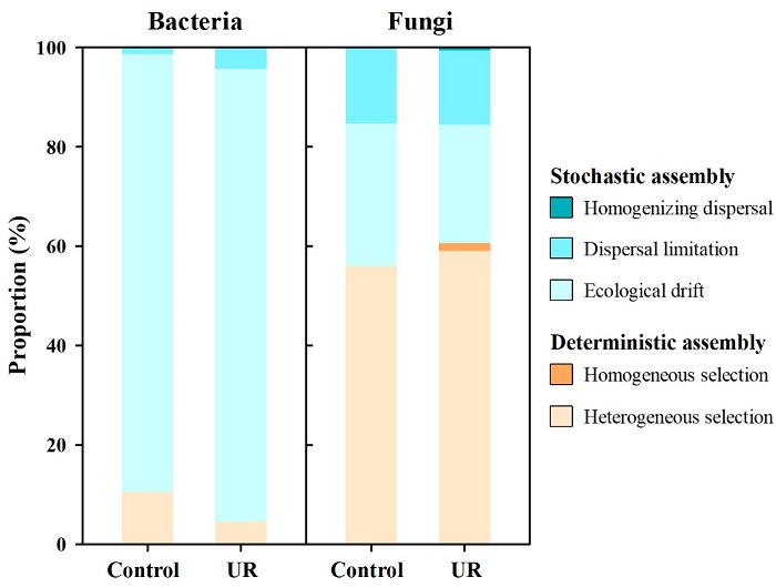 中科院华南植物园氮素生物地球化学创新研究团队(PI:鲁显楷)在鼎湖山南亚热带季风常绿阔叶林(原始林)建立植被去除长期试验研究样地,通过利用第三代高通量测序技术探讨了土壤细菌和真菌群落结构及其组装过程对林下植被去除(understory removal, UR)的响应。研究发现,(1)植被去除显著改变了真菌群落结构,但细菌群落结构仍保持稳定;(2)细菌群落组装主要由随机性过程主导,而真菌更多地受异质选择(确定性过程)支配;(3)林下植被去除半年后,细菌和真菌群落的组装过程均未发生改变。这些结果表明,热带森林中林下植被缺失可以迅速改变土壤微生物群落结构,但不影响群落组装过程。该研究首次报道了植被去除对热带森林土壤微生物群落组装的影响,相关结果有助于认识林下植被在维持森林生态系统稳定性上的重要性,对森林经营管理和生态恢复实践具有重要的参考价值。