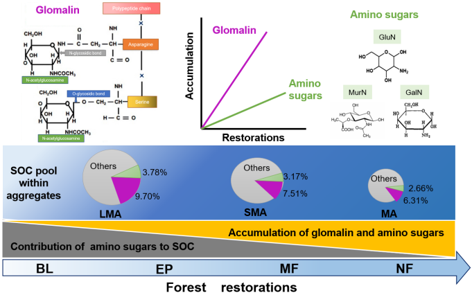 中科院华南植物园恢复生态学任务团队基于小良热带海岸生态系统定位研究站长达60年的植被恢复序列,探究了植被恢复过程中球囊霉素相关土壤蛋白与氨基糖的积累特征及其土壤有机碳库的贡献。研究发现:(1)裸地造林大大增加了球囊霉素相关蛋白和氨基糖在土壤中的积累,但降低了它们对土壤有机碳库的贡献;(2)恢复过程中球囊霉素相关蛋白比氨基糖积累更快,对土壤有机碳库的贡献更大,表明森林恢复过程中丛枝菌根真菌在调节土壤碳循环方面发挥着重要作用,丛枝菌根真菌植物的引入可以作为一种有效的恢复策略来促进土壤有机碳的固持;(3)土壤碳:磷比在调节微生物代谢产物积累方面的重要性表明在磷限制的生态系统可以通过施肥管理实现对土壤有机碳固存和稳定性的调控。(4)乡土树种混交林在磷限制的长期适应、磷储存和磷利用效率方面的优势导致其可以快速恢复土壤生物多样性同时显著提升土壤碳固持能力,植物的“功能混搭”可以作为退化生态系统结构和功能协同恢复的优选策略。