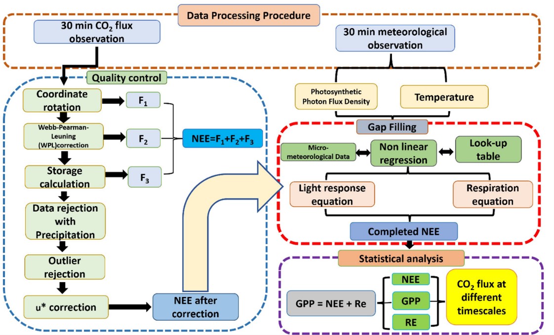 1. 采用涡度协方差技术精准确定森林-大气碳交换量。观察到每日生态系统碳通量的季节趋势,表明其对气候因素的敏感性,如气温、降水和光照。研究阐明鼎湖山自然保护区可作为一个示范性的森林生态系统,可用于揭示森林对大气中CO2的吸收和封存的作用。该成果以“An inter-annual comparative study on ecosystem carbon exchange characteristics in the Dinghushan Biosphere Reserve, a dominant subtropical evergreen forest ecosystem”为题,2021年10月发表于Frontiers in Plant Science(《植物科学前沿》)(IF5-Year=7.255),论文链接:https://doi.org/10.3389/fpls.2021.715340