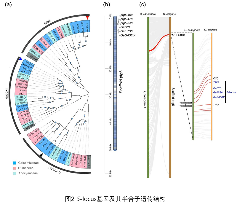 中科院华南植物园张奠湘研究团队以钩吻(Gelsemium elegans)为研究对象,结合基因组学、形态学、繁殖生物学等多重手段,鉴定得到了钩吻中控制二型花柱发育的超基因(S-locus supergene)及其4个组成基因,并系统阐明了其遗传结构和进化。结果显示,在所有目前已研究的二型花柱植物中,二型花柱超基因均为半合子结构,表明二型花柱相关基因具有强烈的遗传结构趋同进化。本研究进一步发现,钩吻中和报春花中控制花柱长度的基因均起源于同一个基因(CYP734A1)的复制,表明了在异型花柱这一花的形态趋同进化下存在基因水平的趋同进化。本研究的结果还表明,异型花柱植物中控制花柱长度的基因均参与油菜素甾醇代谢途径,表明这一类激素在异型花柱植物发育调控过程中具有重要的作用。
