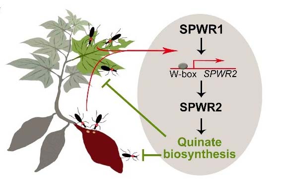 近年来,中国科学院华南植物园侯兴亮研究员带领植物发育与品质调控研究团队聚焦甘薯重要性状遗传基础与高效精准育种技术的研究。由于甘薯小象甲抗性的研究基础非常薄弱,甘薯抗虫资源多样性不高,导致抗虫机制研究进展缓慢,有“薯道难”之称。面对此问题,侯兴亮团队通过与广东海洋大学研究人员合作,花费多年在虫害流行严重的华南地区搜集不同的甘薯材料,并进行抗虫评价。历经三年田间筛选,获得了两份珍贵的甘薯小象甲高抗种质。之后,他们利用抗感种质构建F1遗传群体,同时克服了控制条件下抗虫表型难检测、不稳定的困难,建立了稳定的甘薯小象甲抗虫可控评价体系,最终成功定位并克隆了两个甘薯小象甲抗性关键基因SPWR1(Sweet Potato Weevil Resistance 1)和SPWR2。值得注意的是,研究者们还克服了甘薯遗传转化操作难、转化率低、周期长的问题,利用甘薯自身快速增生能力,配合根癌农杆菌(非发根农杆菌)定向注射手段,开发了一种高效稳定的新型甘薯遗传转化方法。随后,大量的甘薯遗传材料证明了SPWR1和SPWR2均正向调控甘薯小象甲抗性;多种生理生化实验表明甘薯小象甲侵害可诱导SPWR1编码的WRKY转录因子特异结合抗性等位基因SPWR2启动子的W-box元件,从而激活后者的基因表达;而SPWR2编码的蛋白是甘薯奎尼酸合成途径的关键酶,其进一步启动了下游奎尼酸衍生物的生物合成,以此抵御甘薯小象甲侵害。进一步的昆虫理化实验也证明携带有1-羟基-奎尼酸基团的衍生化合物均表现出对甘薯小象甲肠道消化酶和活动的抑制活性。