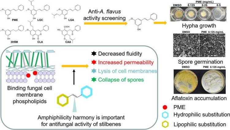 中国科学院华南植物园邱声祥研究组从木豆Cajanus cajan (L.) Millsp.叶中发现了强效的抑真菌化合物PME(Pinosylvin monomethyl ether)。抑菌谱显示,PME对农业真菌和人类三大致病真菌都有不同程度的抑制效果,特别是PME能够抑制黄曲霉孢子萌发和黄曲霉毒素B1累积。研究表明,PME能够结合细胞膜磷脂,导致细胞膜流动性降低、渗透性增大、内容物外渗。PME处理的黄曲霉孢子表现出细胞壁自溶状表型,代谢组分析发现PME结合细胞膜磷脂不仅导致膜流动性和渗透性改变,还能进一步造成膜溶解,孢子结构坍塌,从而产生自溶状表型。鉴于PME的强抑真菌功效与良好的安全性,其在农业、饲料和食品加工行业具有较大的应用潜力。