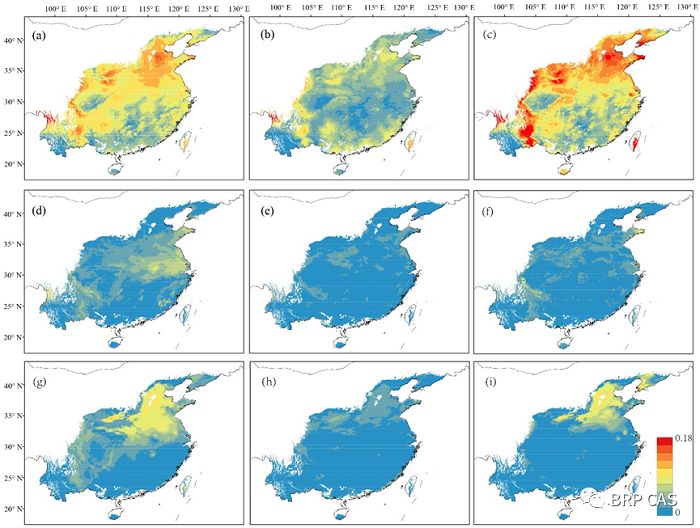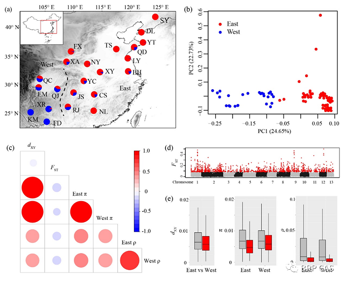 中科院华南植物园王宝生研究员课题组以我国广泛分布的壳斗科栎属物种麻栎(Quercus acutissima)为研究对象,基于群体遗传学和生态基因组学理论,通过遗传-生态因子建模方法探究了该物种在未来气候条件下的适应能力。该研究基于全基因组重测序数据揭示了麻栎的群体结构与分化历史,证实了群体历史和连锁选择作用共同塑造了异质性的基因组景观(图1);通过遗传-环境关联分析鉴定出一系列与环境适应性相关的功能基因,说明多基因选择是麻栎物种适应性进化的重要机制;进一步基于生态因子差异与遗传成分差异之间的拟合分析(Generalized dissimilarity modelling)量化了麻栎群体为了应对气候变化理论上所需的遗传偏移。该研究发现,边缘群体面临着更高的局部灭绝风险,并且在未来环境中可能无法通过迁移的方式找到新的栖息地;我国北方地区未来的气候条件很难适合麻栎生存(图2)。