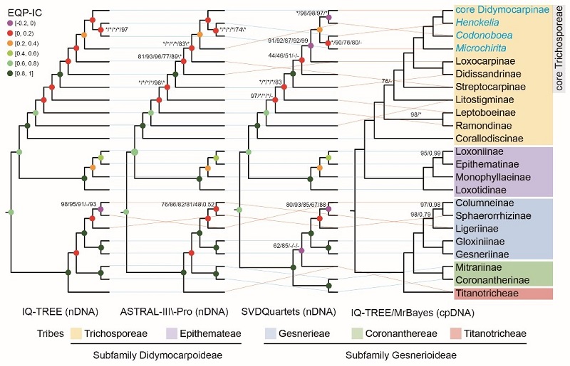 图2. 基于不同方法及数据集获得的苦苣苔科各主要支系的系统发育关系