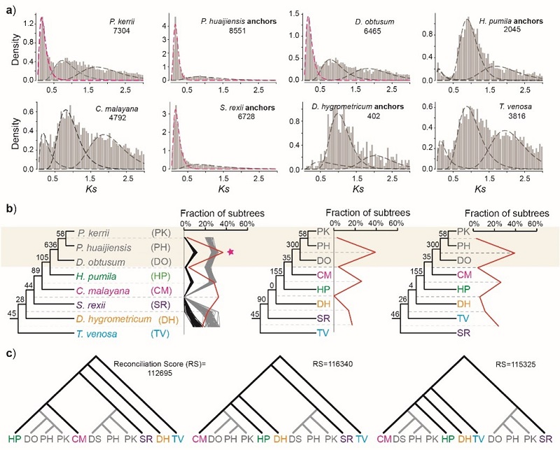 图3. Ks及系统发育基因组分析揭示核心长蒴苣苔亚族异源多倍体起源