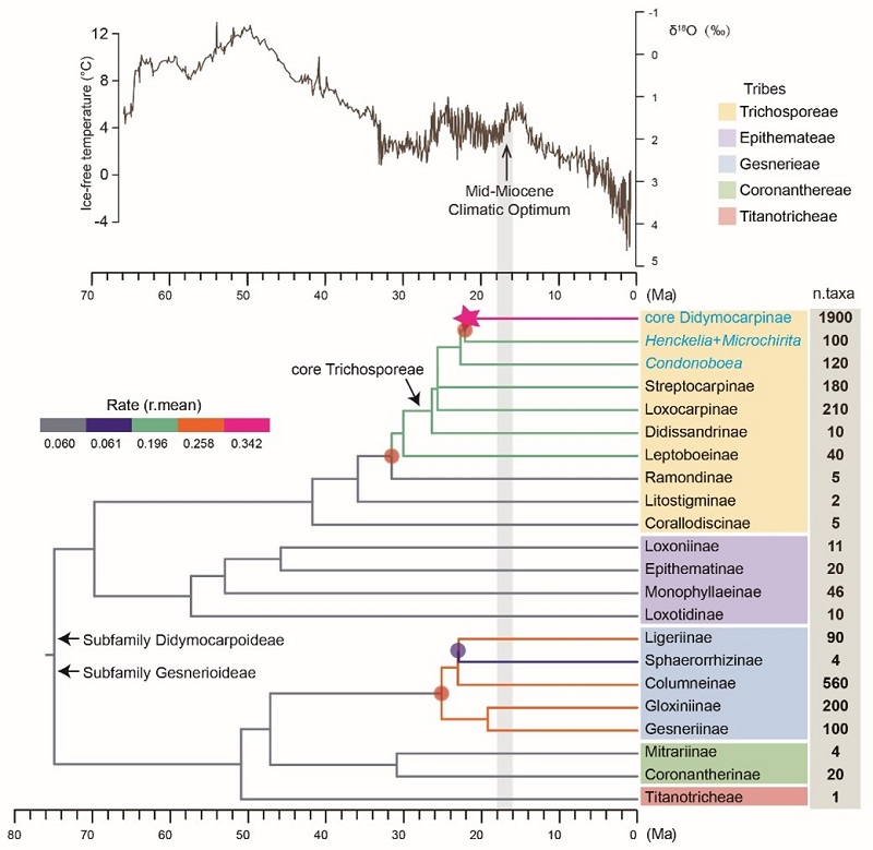 中国科学院华南植物园康明研究团队利用转录组数据重建了苦苣苔科137个物种(包括了5个族19个亚族)的系统发育关系(图2),结果发现存在大量的叶绿体-核基因系统发育冲突和基因树-物种树冲突,进一步分析发现不完全谱系分选和杂交是造成系统发育冲突的主要原因。在此基础上,该研究团队结合全基因组和转录组数据,并利用综合的分析方法,揭示核心长蒴苣苔亚族(包括长蒴苣苔亚族中除汉克苣苔属Henckelina、钩序苣苔属Microchirita及齿药苣苔属Codonoboea以外的所有属)经历了一次特有的全基因组复制事件,并进一步证实该基因组复制事件是异源多倍化的结果(图34),这一结果表明核心长蒴苣苔亚族是异源多倍体起源。结合分化时间及物种形成速率分析,发现核心长蒴苣苔亚族在经历异源多倍化事件后其物种分化速率增加,说明异源多倍化可能促进了该类群的快速物种分化(图5)。