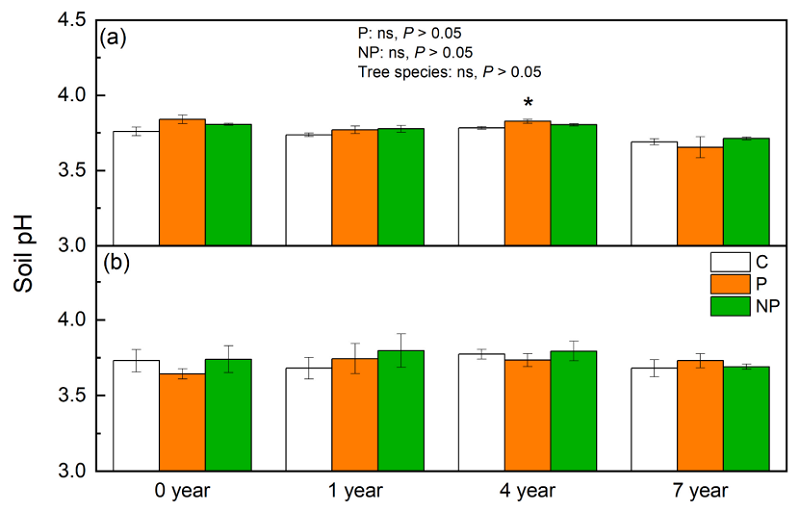 早期有研究认为,长期氮沉降影响热带森林土壤磷有效性并可能进一步加剧土壤酸化。磷添加对土壤酸化有缓解作用,一般有以下3种可能途径:1)添加的磷直接与土壤中的铁和铝反应,因而减轻酸性土壤中的铝毒,并增加pH值;2)磷添加促进植物对有毒元素的吸收从而间接减轻土壤酸性和酸性阳离子的潜在毒性;3)磷添加通过调控土壤微生物及胞外酶活性,影响土壤有机质和凋落物的降解进而影响其对养分元素的释放,间接减缓土壤酸性。然而,磷添加对土壤酸性的正效应的研究仅集中在热带自然林,而且是基于短期的研究,长期磷输入对热带人工林的土壤酸性是否也会有类似效应还缺乏实验证据。