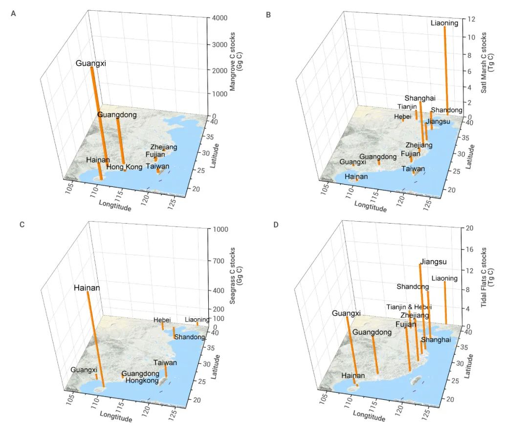 中国科学院华南植物园小良站站长王法明研究员联合国内外海岸带碳汇研究领域的主要科学家,探讨中国的海岸带蓝碳生态系统如何为减缓气候变化做出贡献(图1)。从全国范围来看,中国的海岸带蓝碳生态系统总面积144万公顷,其碳储量高达118 Tg。这其中包括红树林2.6万公顷、盐沼湿地12.7-34.3万公顷,海草床1.4-2.6万公顷(图2)。此外中国海岸带生态系统还包括了大量的无植被滨海滩涂湿地,其面积高达25-110万公顷。中国的红树林总碳储量约6.9 Tg,海草床生态系统总碳储量约1.4 Tg,远低于盐沼湿地的总碳储量25 Tg。此外,我国未被植被覆盖的滨海滩涂面积广大,总碳储量高达27-85 Tg(图3)。