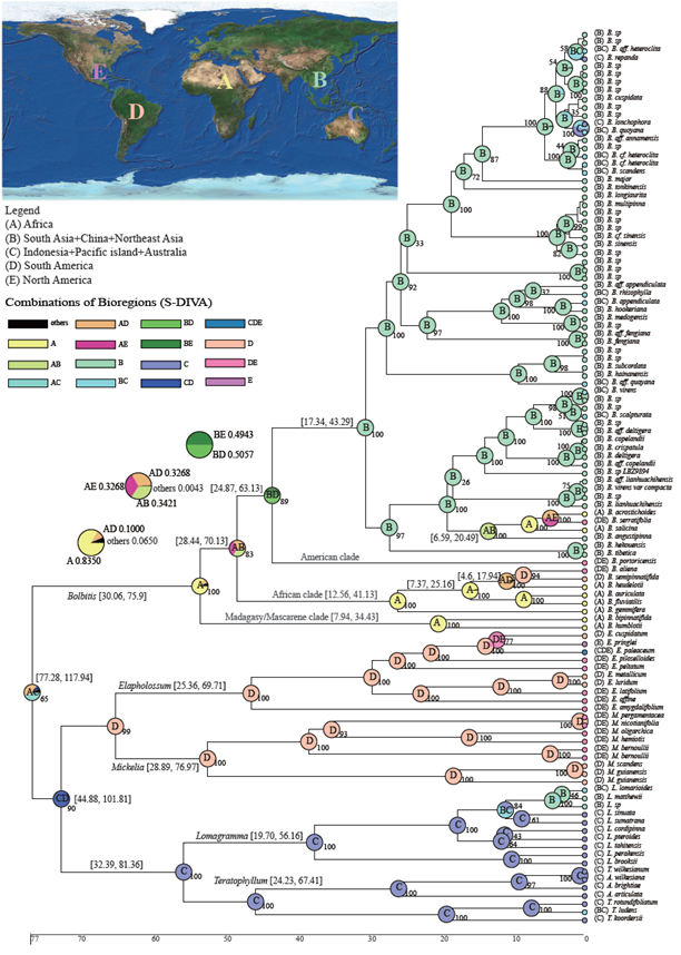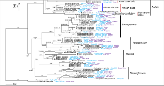 结合化石数据和地理分布数据,采用BEAST和RASP进行分歧时间估计及祖先分布区重建,显示实蕨属最早起源于非洲,并向亚洲扩散分布,并在近期(6.59–20.49 Ma)从亚洲经非洲向美洲扩散,形成了当下的泛热带间断分布的格局(图2)。进一步地,以亚洲实蕨属作为主要研究对象,分析其属内多样性形成的可能原因。亚洲实蕨属可分为6个高支持率的Subclade,分别是Heteroclitae subclade,Egenolfianae subclade,Sinuatae subclade,Quoyanae subclade,Bolbitianae subclade,Hekouenses subclade。这些Subclade内部的谱系/物种关系总体上得到了很好的解析,除了Heteroclitae subclade和Quoyanae subclade。其中,已有文献记载的两个杂交种分别来自于Heteroclitae subclade和Quoyanae subclade,结合实蕨属内的形态变异,我们推测自然杂交促进了东亚实蕨属内的多样化形成。