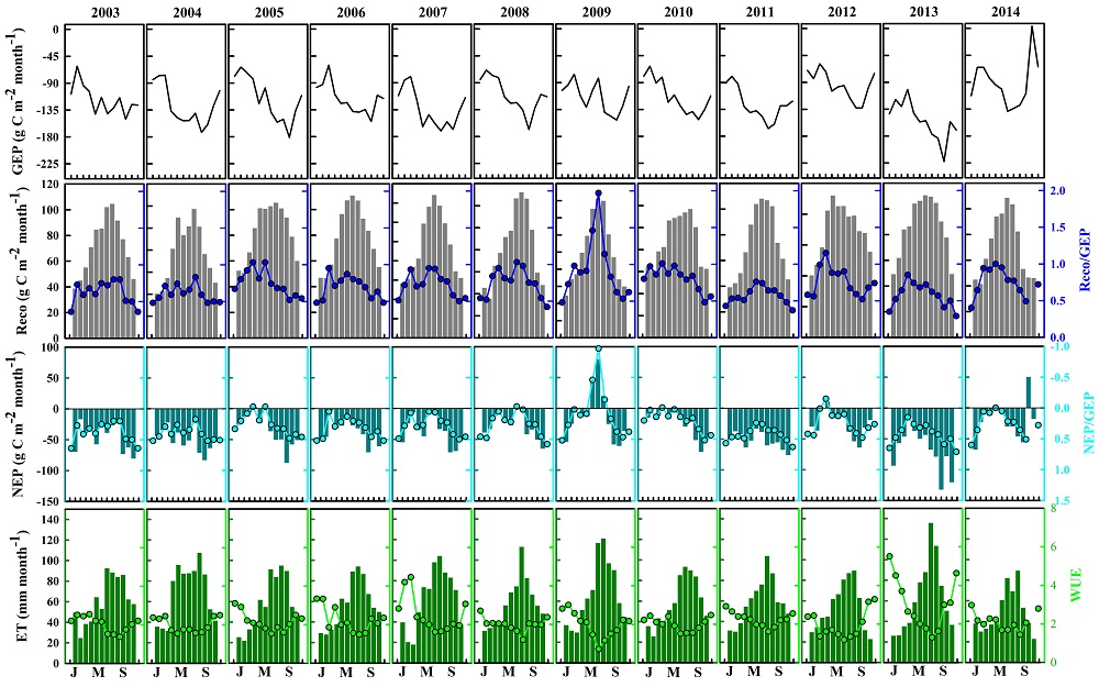 中国科学院华南植物园王林华助理研究员以南亚热森林生态系统为研究对象,利用森林冠层通量观测12年(2003-2014)的数据,明确了区域水热等相关环境变量的季节量变趋势,分析森林冠层季节碳通量组分和蒸散发对水热等相关环境变量变化的响应,量化生态系统总生产力(GEP)和生态系统呼吸(Reco)对各环境变量变化响应差异,发现GEP和Reco对水热因子响应的敏感性季节量变特征决定了生态系统季节和年度尺度上的净生产力(NEP)变化。研究结果表明了森林冠层通量对水热有效性变化的响应程度和非同步性响应决定其季节变化模式,从而对评估和预测森林生态系统过程对气候变化的响应具有重要意义。