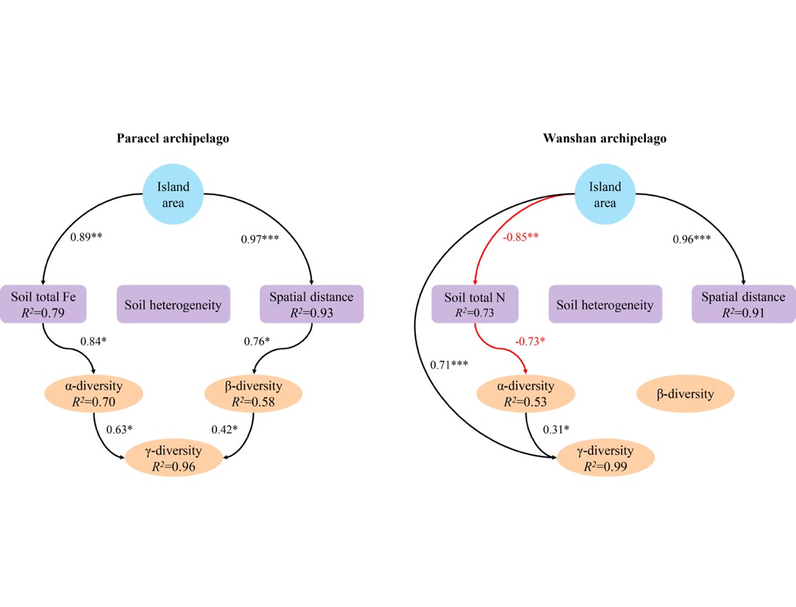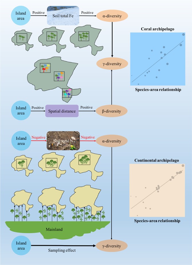 中国科学院华南植物园植物科学研究中心科研团队在前期研究的基础上选择两组不同类型的海洋岛屿,包括16个热带珊瑚岛(西沙群岛)和21个热带大陆性海岛(万山群岛)(图1),对589个样方的植物物种多样性数据和土壤元素进行了分析。结果表明虽然2组不同类型的海岛植物物种多样性分布格局均符合生物地理学经典的“种-面积关系”理论(岛屿面积越大、物种多样性越高),但是2组不同类型的海岛存在不同的植物物种多样性维持机制。对于热带珊瑚岛而言,决定群落结构和植物物种多样性的主要因素是土壤养分和空间距离,土壤Fe含量和 多样性正相关;而对于大陆性海岛而言,面积效应更加明显、土壤养分的影响次之,土壤N含量和 多样性负相关(图2)。总体而言,生境质量(habitat quality)对维持热带珊瑚岛的植物物种多样性尤其重要,而被动取样效应(passive sampling effect)对热带大陆性海岛的植物物种多样性影响更为显著(图3)。