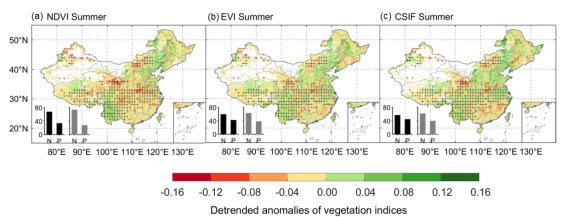 近些年,热浪和干旱发生的频率、强度和持续时间日益增加,成为全球变化的重要特征之一,也是人类面临最严峻的挑战之一,对陆地生态系统功能和人类社会生产生活造成严重影响。2022年夏季,中国经历了一场史无前例的热浪和干旱事件。本研究基于1979-2022年再分析气候数据,发现中国2022热浪发生的频次、热浪发生天数以及累积高温异常突破了历史记录。本研究进一步以中国植被区域为研究区域,基于多源遥感数据,发现2022高温热浪、干旱及其耦合作用造成中国区域超过一半以上的植被生长降低。具体表现为归一化植被指数(NDVI)降低66.89%,增强植被指数(EVI)下降58.68%,连续日光诱导叶绿素荧光(CSIF)下降56.47%。而高温是2022年夏季植被生长降低的主要驱动因素。
