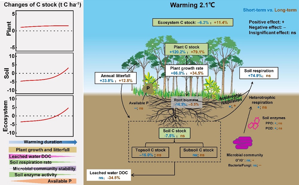 基于此,鼎湖山站刘菊秀研究员团队,利用鼎湖山站的长期野外自然增温实验平台,研究了南亚热带森林生态系统碳动态对长期增温的响应模式及驱动机制。研究发现,在增温2.1 下,南亚热带森林生态系统碳储量在短期增温下(1-2年)降低3.8%,但在长期增温下增加13.4%(图1)。生态系统碳储量随增温持续时间的相反变化主要是由于植物和土壤碳动态对长期增温的异步响应与适应引起的。短期增温同时促进了植物的生长和土壤呼吸,但由于更高的土壤呼吸碳排放,森林生态系统碳储量降低。长期增温下,由于养分供给的缓解和植物的生理适应,植物仍能维持高的碳封存能力;同时由于土壤微生物的热适应和土壤水分含量降低时土壤碳损失减弱以及植物碳输入的增加使土壤有机碳库保持稳定,因而生态系统碳储量增加。