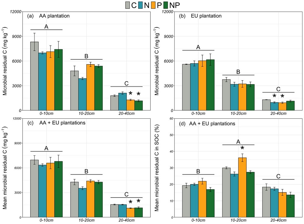 中国科学院华南植物园生态中心范琳杰博士在郑棉海副研究员的指导下,依托广东省鹤山森林生态系统国家野外科学观测研究站的长期氮磷添加试验平台,选取两种典型的亚热带人工林,即大叶相思林(豆科林,Acacia auriculiformis)和尾叶桉林(非豆科林,Eucalyptus urophylla)为研究对象,探索两种亚热带人工林土壤微生物残体碳在不同土层的变化及其对长期氮和磷添加的响应机理。经过长期(12年)的氮磷添加处理,发现不同土层微生物残体碳浓度的响应存在差异。长期氮和磷添加对表层土壤(0-20cm)的微生物残体碳浓度没有显著影响。磷添加显著降低了两种人工林深层土壤(20-40cm)的微生物残体碳浓度,而氮添加仅降低了尾叶桉林深层土壤微生物残体碳浓度,对大叶相思林的影响不显著。氮和磷同时添加降低了大叶相思林的深层土壤微生物残体碳浓度,但对尾叶桉林没有显著影响。进一步发现,深层土壤的微生物残体碳主要受微生物属性和矿物保护的影响,而在表层土壤中,植物碳输入和矿物保护的作用更为重要。对于深层土壤而言,磷添加导致微生物周转和钙结合碳浓度降低,从而减少了微生物残体碳的积累。虽然表层土壤微生物周转和钙结合碳也减少,但由于表层凋落叶分解速度加快及微生物量增加,植入碳的输入和微生物量的增加可能弥补了表层微生物残体碳的减少,导致表层土壤微生物残体碳浓度无显著变化。这项研究表明,长期大气氮沉降和土壤磷缺乏可能会影响亚热带森林底层土壤碳的稳定性,未来研究需要更多地关注森林不同土层(尤其是底层土壤)有机碳的稳定性及其驱动机理,这对于准确理解和预测亚热带森林土壤固碳潜力至关重要。