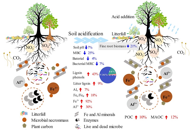 中国科学院华南植物园生态中心俞梦笑在闫俊华和王应平研究员的共同指导下,依托鼎湖山站长期模拟酸添加控制实验平台,对酸添加处理下季风常绿阔叶林土壤有机碳累积及固存机制开展研究。研究发现,从碳组分看,长期酸添加显著促进土壤颗粒有机碳(POC)和矿质结合碳(MAOC)的累积;从碳的来源看,长期酸添加下微生物残体碳累积降低,而植物源的木质素酚显著增加。进一步分析发现,酸添加带来的土壤木质素酚的增加和土壤微生物分解抑制促进了POC的累积,而MAOC的累积则主要归因于铁铝氧化物和金属阳离子的有机矿质保护作用。该研究结果表明随着土壤酸化,土壤矿质保护作用与植物源碳的持续输入提高了土壤有机碳的固存与稳定。本研究强调了森林土壤酸化促进了矿质保护机制和植物源碳的累积。该发现从机理上支撑了深度酸化森林土壤持续固碳增汇的功能。