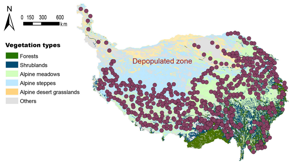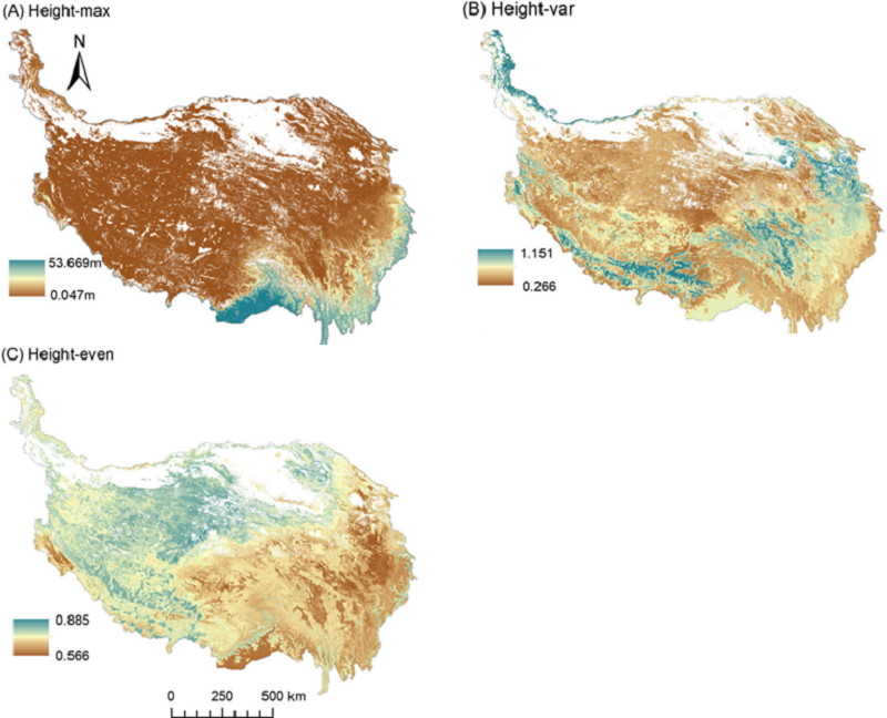 针对以上两点不足,鼎湖山站团队联合国内高校、科研机构在植物群落垂直结构复杂性地理格局及其驱动机制方面开展研究。在青藏高原开展了大规模的野外调研。基于网格抽样的方法调查了2013块标准样方(图1),并采用3个参数来量化垂直结构复杂性,即样方内的最大植物高度(Height-max)、植物高度的变异系数(Height-var)和植物高度的香农均匀度(Height-even)。研究检验了一个假设,即随着气候条件从优越到极端的转变,主导垂直结构复杂性空间变异的机制将逐渐从资源获取策略转向保护优先策略;并绘制1-km空间分辨率的垂直结构复杂性图集,这将为相关宏观生态学研究提供重要参数(图2)。