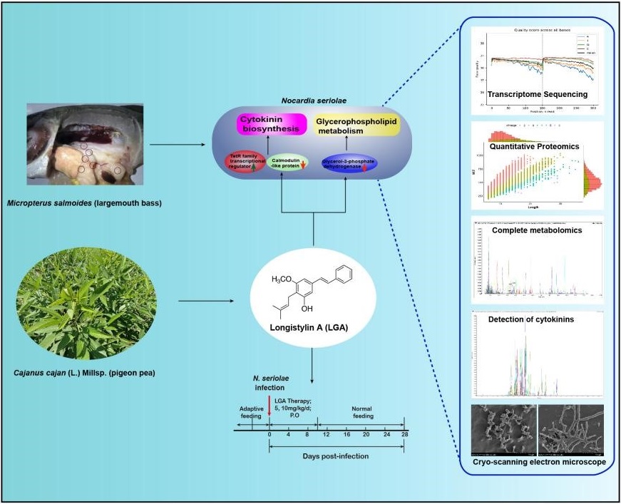 中国科学院华南植物园植物科学研究中心邱声祥研究员及其团队,调查了从木豆叶中分离出的天然菧类化合物木豆素A(Longistylin A,LGA)作为潜在抗生素对抗诺卡菌病的效果和机制。研究团队从木豆的叶子中分离出菧类活性成分木豆素A(Longistylin A,LGA),通过转录组、蛋白质组和代谢组的多组学分析以及细胞分裂素定量分析、冷冻扫描电子显微镜检查等多种技术手段,首次揭示了LGA通过干扰甘油磷脂代谢和细胞分裂素生物合成对鰤鱼诺卡氏菌(Nocardia seriolae)感染表现出显著的疗效。