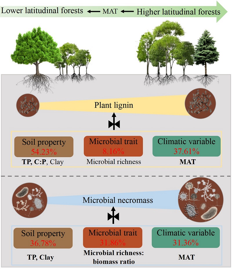中国科学院华南植物园生态与环境科学研究中心聂彦霞副研究员等科研人员以中国东部5个典型森林为研究对象,以木质素酚和氨基糖为标志物,结合气候、土壤性质和微生物群落特征,探究植物和微生物残体含量及其对土壤有机碳贡献的驱动因素。研究发现,土壤中木质素酚和氨基糖含量均随纬度的升高而逐渐增加,而其对土壤有机碳的贡献呈现不同趋势,木质素酚在土壤有机碳中的占比随纬度升高呈现先减少后增加的趋势,氨基糖在土壤有机碳中的占比则成线性增加的趋势。相关分析表明微生物残体碳对土壤有机碳的贡献随有机碳含量的增加而增加,而植物残体碳对土壤有机碳中的贡献与土壤有机碳无明显的关系。普通最小二乘回归分析的结果显示,植物和微生物残体碳的含量及其对有机碳的贡献,主要受气候、微生物群落和土壤性质的共同影响,其中年平均温和土壤磷含量是影响木质素酚积累的主要控制因子,而年平均温度、微生物丰富度与生物量的比值是影响微生物残体碳积累的重要控制因子。