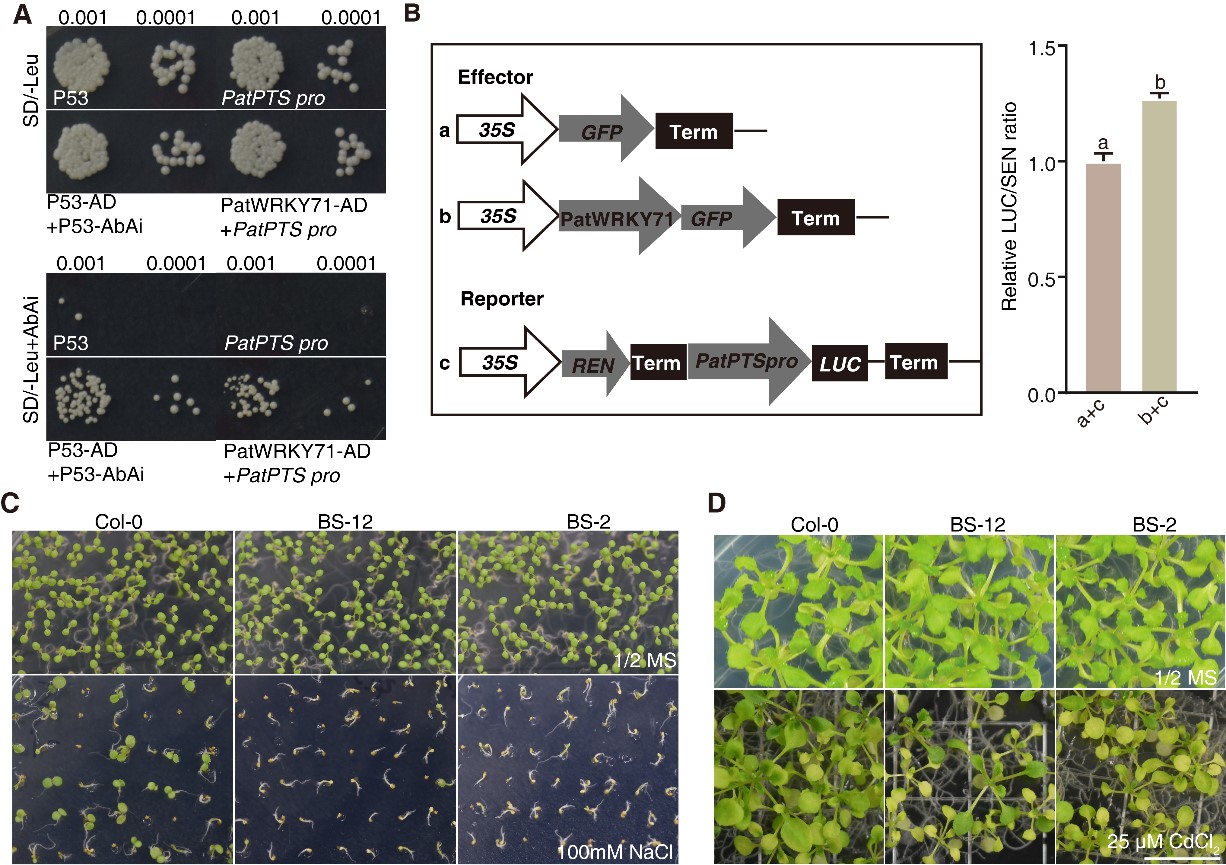 图. A-B:PatWRKY71结合在PatPTS启动子上并上调其表达。