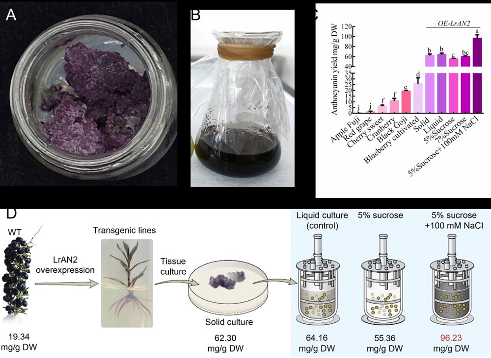 注:图1A为过表达LrAN2的转基因愈伤组织;图1B为过表达LrAN2的愈伤组织悬浮细胞系;图1C为悬浮细胞培养条件优化后花青素含量变化;图1D为黑果枸杞花青素代谢工程合成花青素示意图。