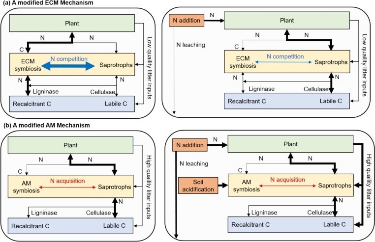 基于此,中国科学院华南植物园鼎湖山站通过全球尺度的整合分析,揭示了生态系统优势树种的菌根关联在预测氮沉降下C-EEAs和土壤碳储量中的重要作用(图1)。具体而言,在以外生菌根植物为主的生态系统中,氮添加显著刺激了纤维素酶活性,但抑制了木质素酶活性,从而导致土壤碳储量的显著增加。在以丛枝菌根植物为主的生态系统中,氮添加对C-EEAs和土壤碳储量的影响均不显著。此外,两类生态系统中,C-EEAs和土壤碳储量对氮添加响应的差异可能主要与外生菌根和丛枝菌根树种特定的氮获取策略有关。这些结果表明,在以外生菌根植物为主的生态系统中,氮沉降对土壤碳储量的刺激作用可能被低估。