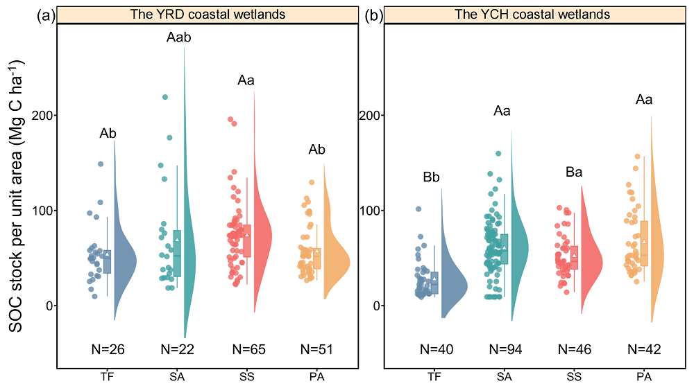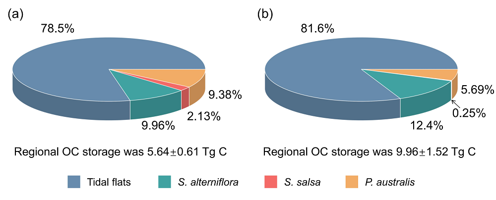 结果显示,在两个研究区域内,植被覆盖的盐沼湿地单位面积上的有机碳储量明显高于未植被覆盖的潮滩。有趣的是,黄河三角洲的潮滩有机碳储量与盐城海岸的盐地碱蓬盐沼相当。研究估算出,黄河三角洲的区域有机碳储量为5.64±0.61 Tg C,而盐城滨海湿地则为9.96±1.52 Tg C。尽管滨海潮滩的单位面积有机碳储量较低,但由于其在中国沿海的广泛分布,它们成为了区域有机碳储存的主要贡献者,占到区域总储量的75%以上。该研究揭示了不同类型湿地之间有机碳储量的差异,并强调了在估算蓝碳时考虑滨海潮滩的重要性,尤其是对于像中国这样拥有广泛分布潮滩的国家而言。