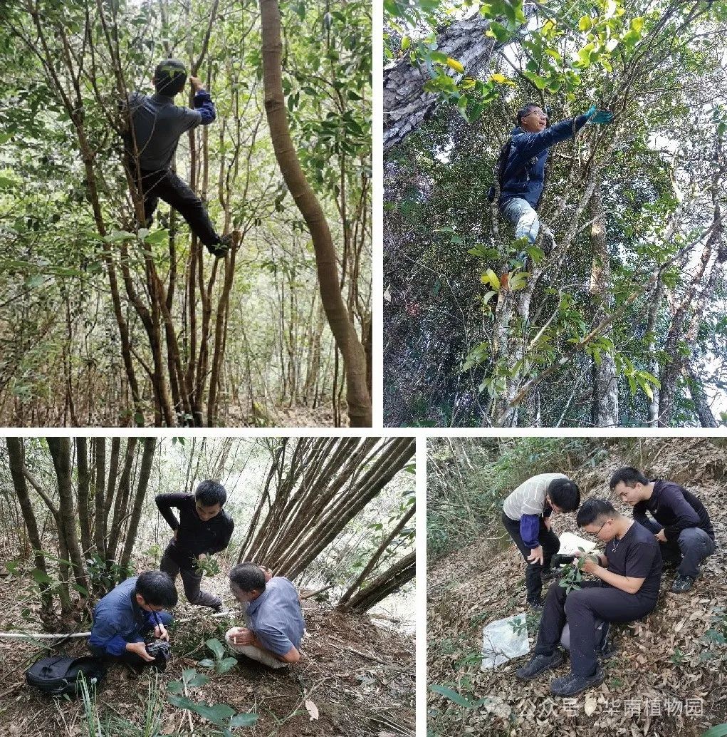 2022年,华南植物园高级工程师宁祖林在对广东省珍稀濒危植物迁地保育现状评估时发现广东省特有的国家重点保护极危植物毛柄木樨未被广东省植物园等相关迁地保护机构收集保存,进而对其进行文献资料检索、标本查阅、在线数据库检索和相关专家咨询,进一步确认尚无相关采集监测记录。为了寻找这一珍稀濒危植物。2023年2月,宁祖林带领华南植物园引种保育团队前往毛柄木樨模式产地进行考察,同时携带模式标本彩色打印照片对周边村民进行走访调查以寻找毛柄木樨踪迹(图5)。经过团队系统调查和细致辨识,最终寻找到了与模式标本叶形极为相似的植株,并相继在9月份和10月份采集到具花和果实的标本(图6)。
