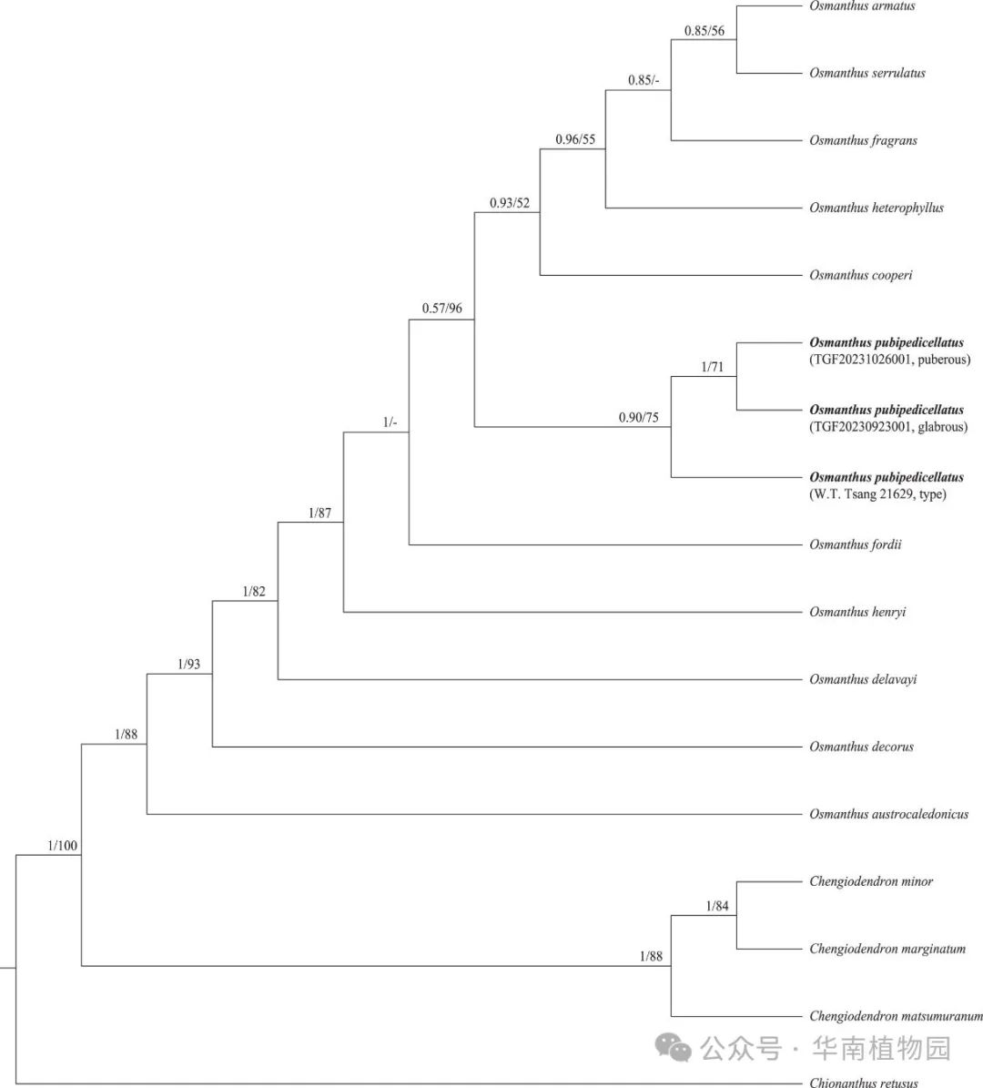 为了确认我们调查发现的木樨属物种就是1932年曾怀德所采集的毛柄木樨,一方面对照模式标本进行形态特征鉴定,同时对模式标本采集DNA样品进行分子鉴定。形态特征鉴定:我们对毛柄木樨野外种群进行了持续监测,并观察到叶柄和花梗被毛特征并不稳定,存在无毛个体。通过叶、花、果形态特征观测,发现有毛个体和无毛个体的特征与模式标本极为相似,将其鉴定为毛柄木樨(图7),并补充了毛被、果实和种子形态特征描述。毛柄木樨与狭叶木樨形态特征更为接近,但狭叶木樨花梗无毛,叶片狭椭圆形至披针形,先端长渐尖,呈长尾状,可较好的区分(图8)。