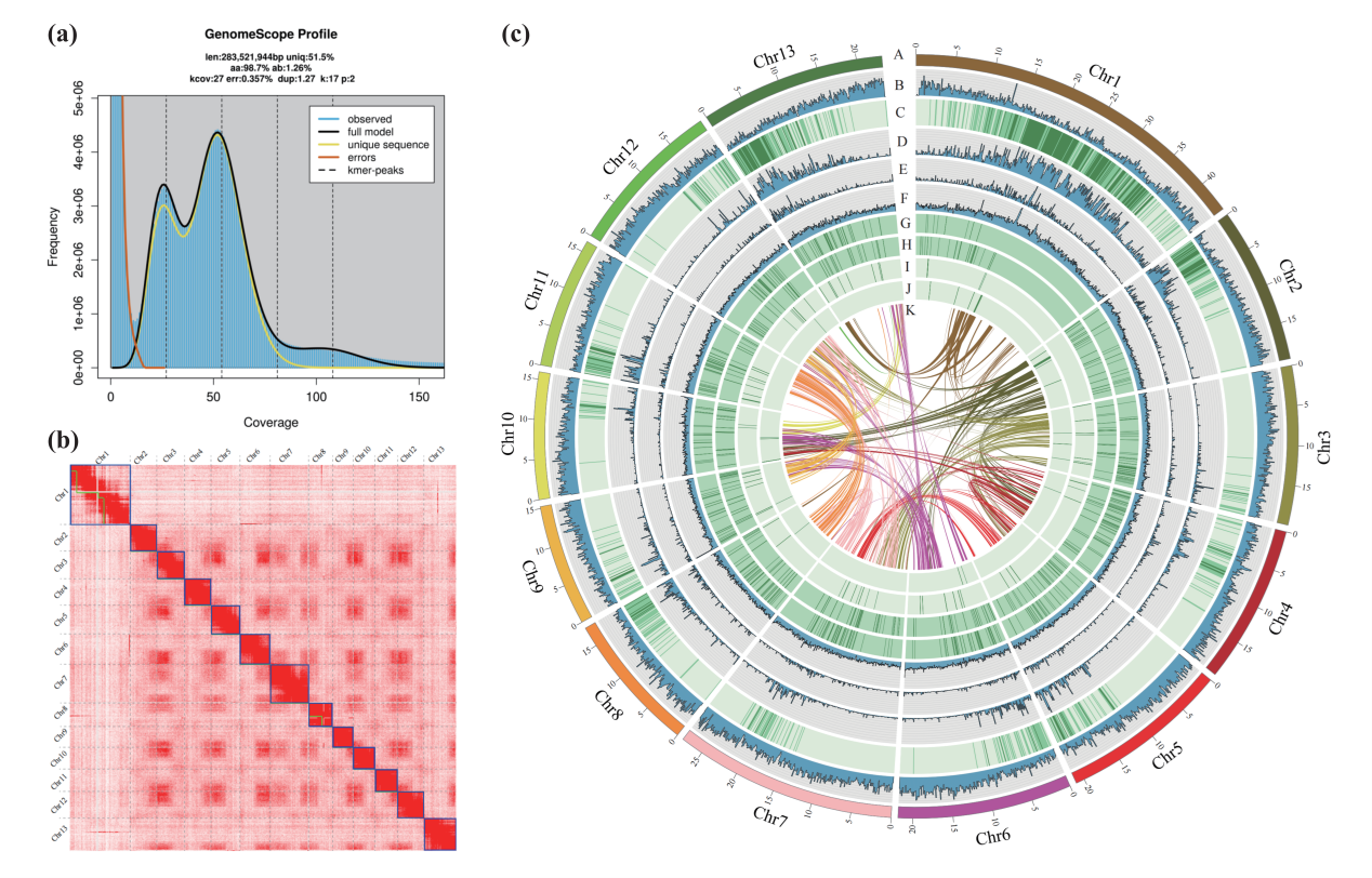图. 粗叶榕的基因组组装与注释。a. 基因组大小评估; b. Hi-C互作热图; c. 基因组圈图