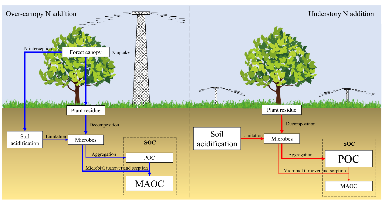中国科学院华南植物园环境生态学研究方向依托广东省石门台“林冠林下氮添加实验”平台,对比探究了长期(11年)林冠、林下氮添加对森林土壤有机碳动态的影响机制。发现,由于林冠对活性氮的吸收和截留,林冠氮添加对土壤有机碳积累的促进作用显著弱于传统的林下氮添加;林下氮添加显著增加了土壤颗粒有机碳含量,而冠氮添加则显著增加了矿物结合态有机碳含量,其原因可能是因为林冠氮添加显著提高了凋落物质量,减缓了土壤酸化,刺激微生物的碳利用,进而促进了颗粒有机碳向矿物结合态有机碳的微生物转化过程。