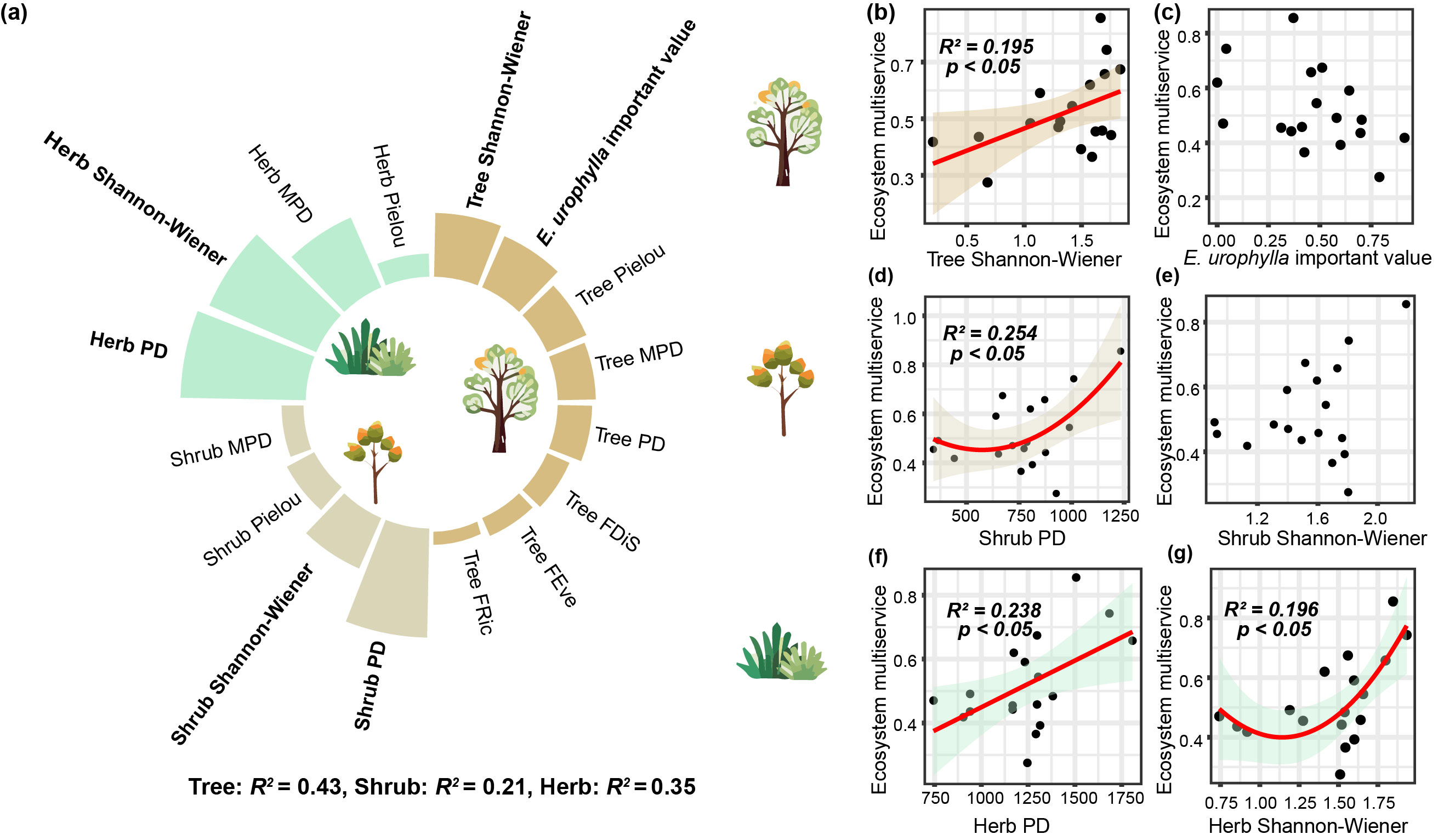图2. 生态系统多服务性与不同植物层多维多样性指数的关系
