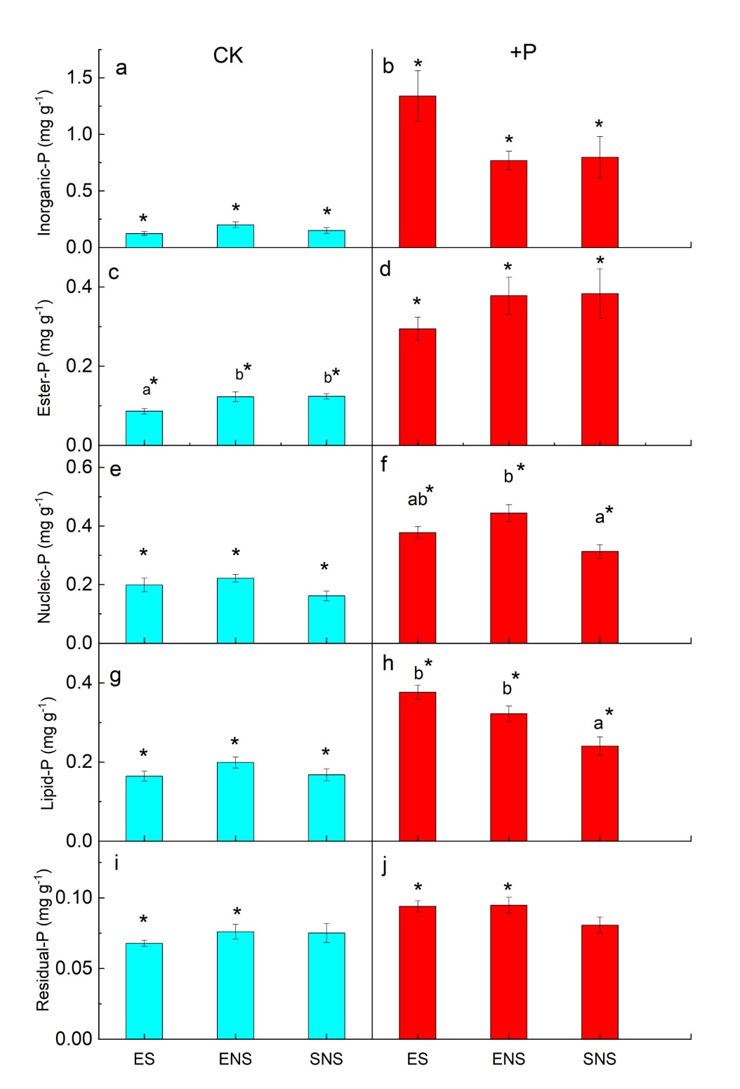 图1. 在缺磷(CK)和富磷(+P)水平下的外来种(ES)、广布本地种(ENS)和狭布本地种(SNS)的五种叶片磷组分含量对比