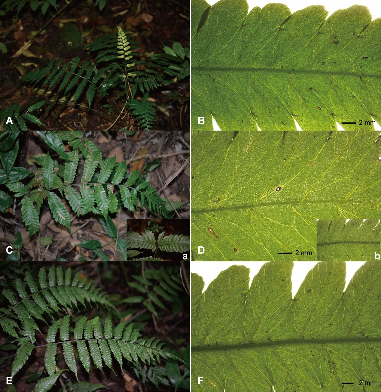 (A, B) Bolbitis sinensis植株及叶脉样式;(C, D) B. × multipinna 植株及叶脉样式;(E, F) B. longiaurita 植株和叶脉样式;(a, b) 显示在 B. × multipinna 中观察到的基部延长的裂片和分离的叶脉。