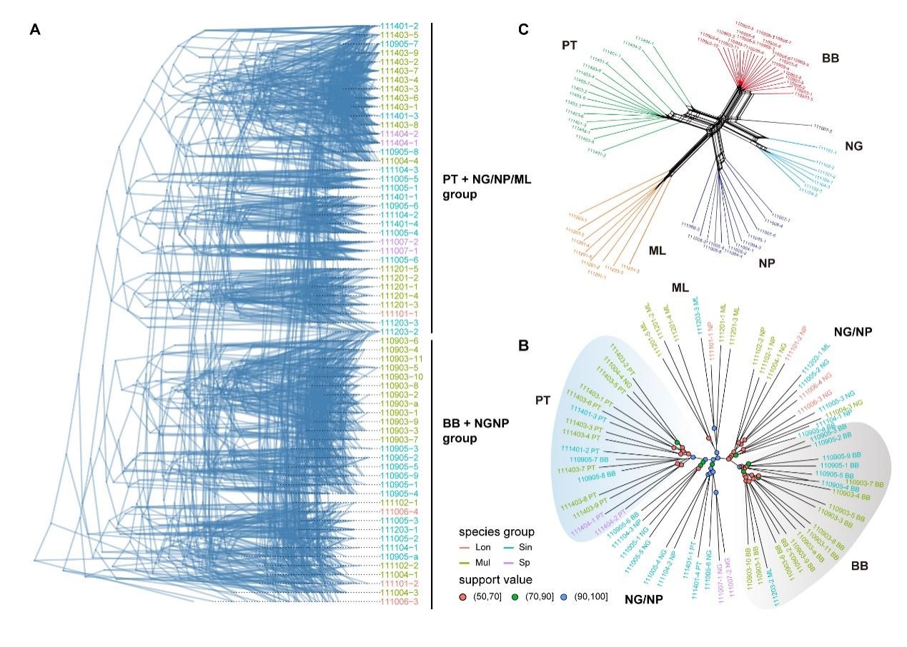 (A) 35棵最大似然一致树的密度树;(B) 代表性数据集所构建的最大似然树,分支上方的数字为 1000 次重复计算的自展支持率,不同颜色的圆圈表示支持率超过 50% 的节点;(C) 基于p1-r0.60 数据集进行的网状分析图。