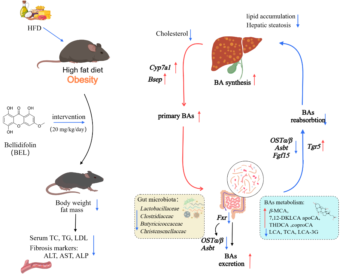 中国科学院华南植物园战略植物资源保育与利用科研团队最新研究发现,北方獐牙菜中的主要活性成分—Bellidifolin(BEL)可通过调控肠道菌群和胆汁酸代谢,显著改善高脂饮食诱导的肥胖及相关代谢异常。研究团队通过高效液相色谱-质谱联用技术(HPLC-MS/MS)从北方獐牙菜提取物中鉴定出25个氧杂蒽酮类化合物,结合网络药理学分析,发现其与脂代谢和动脉粥样硬化通路密切相关。其中,BEL显著降低了血清甘油三酯(TG)、总胆固醇(TC)和低密度脂蛋白(LDL)水平,减轻了肝脏的脂肪变性和炎症损伤。同时,它有效降低了厚壁菌门(Firmicutes)和乳杆菌科(Lactobacillaceae)等促炎菌群的丰度,增加了拟杆菌门(Bacteroidota)等有益菌的比例,从而改善了肠道微环境。此外,BEL通过上调CYP7A1增强了肝脏胆汁酸的合成,通过抑制ASBT和OSTα/β而减少了肠道中胆汁酸的重吸收,促进了粪便排泄,并降低了肝内脂质的沉积。