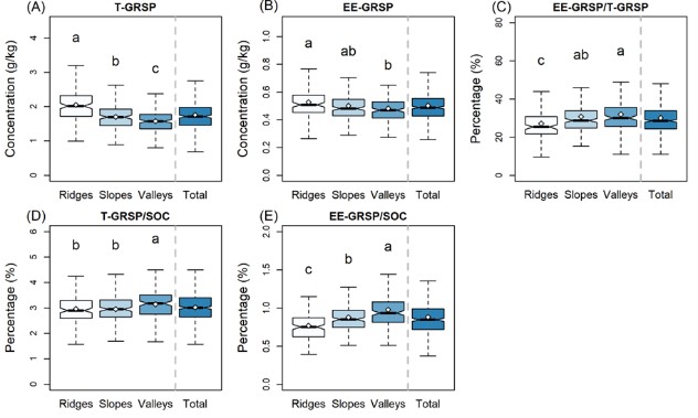 图1. 尖峰岭热带山地雨林三类地形中球囊霉素相关蛋白分布特征对比。注:T-GRSP,总球囊霉素相关蛋白;EE-GRSP,易提取球囊霉素相关蛋白;SOC,土壤有机碳。