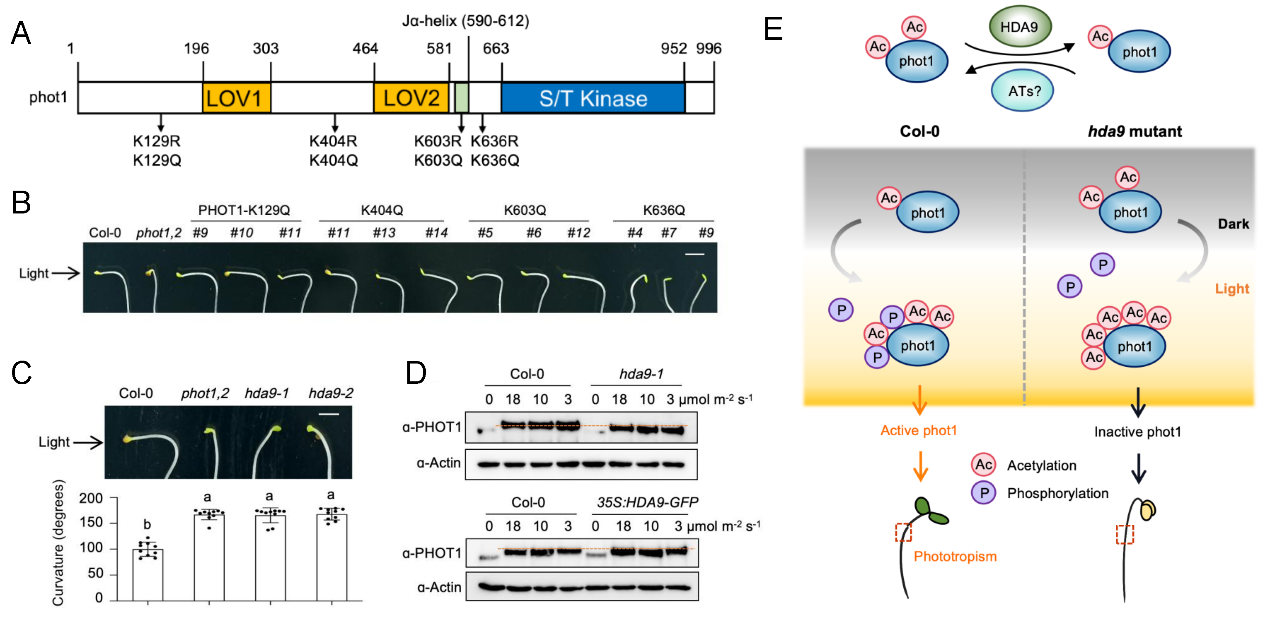 图1. 分子模式:HDA9介导phot1乙酰化-磷酸化动态平衡调控植物向光性