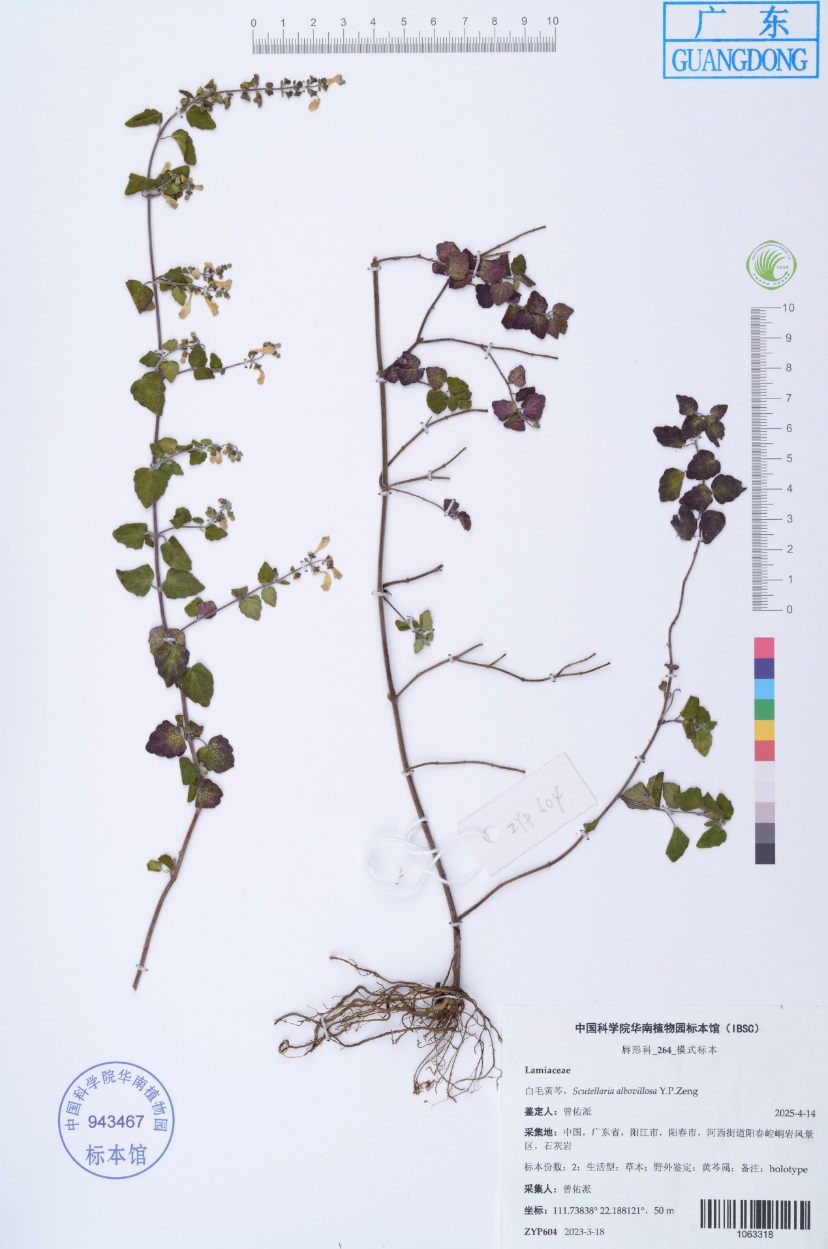 阳春市位于广东省西南部,是一个植物调查相当不充分的区域,随着调查的深入,近几年陆续有植物新种被发现,如阳江川苔草,阳春紫薇、阳春球子草、阳春珠子木、两广珠子木、阳春薹草、阳春蜘蛛抱蛋、木荚南天藤等。2023年3月10日,阳江市植物爱好者陈国棣先生和广东省农科院徐晔春研究员在阳春市春湾镇拍摄到一种黄芩属植物,并采集活体寄到华南植物园。曾佑派博士初步研究后认为该植物为黄芩属一疑似新种,并于3月18日亲自前往春湾镇考察。此行还在阳春市区附近的崆峒岩风景区发现黄芩属另一疑似新种。此后,曾佑派利用工作之余,花费了近两年时间从头研究黄芩属,几近完整搜集该属国产及毗邻地区所产种类的文献,通过网络数据库(CVH、GBIF、JSTOR以及各大国外标本馆数据库)和到馆查阅该属模式标本和普通标本,还通过植物图像库如PPBC、CFH熟悉该属植物活体,最终确认阳春这两种黄芩属植物为新种,并分别把它们命名为阳春黄芩(Scutellaria yangchunensis)和白毛黄芩(S. albovillosa)。