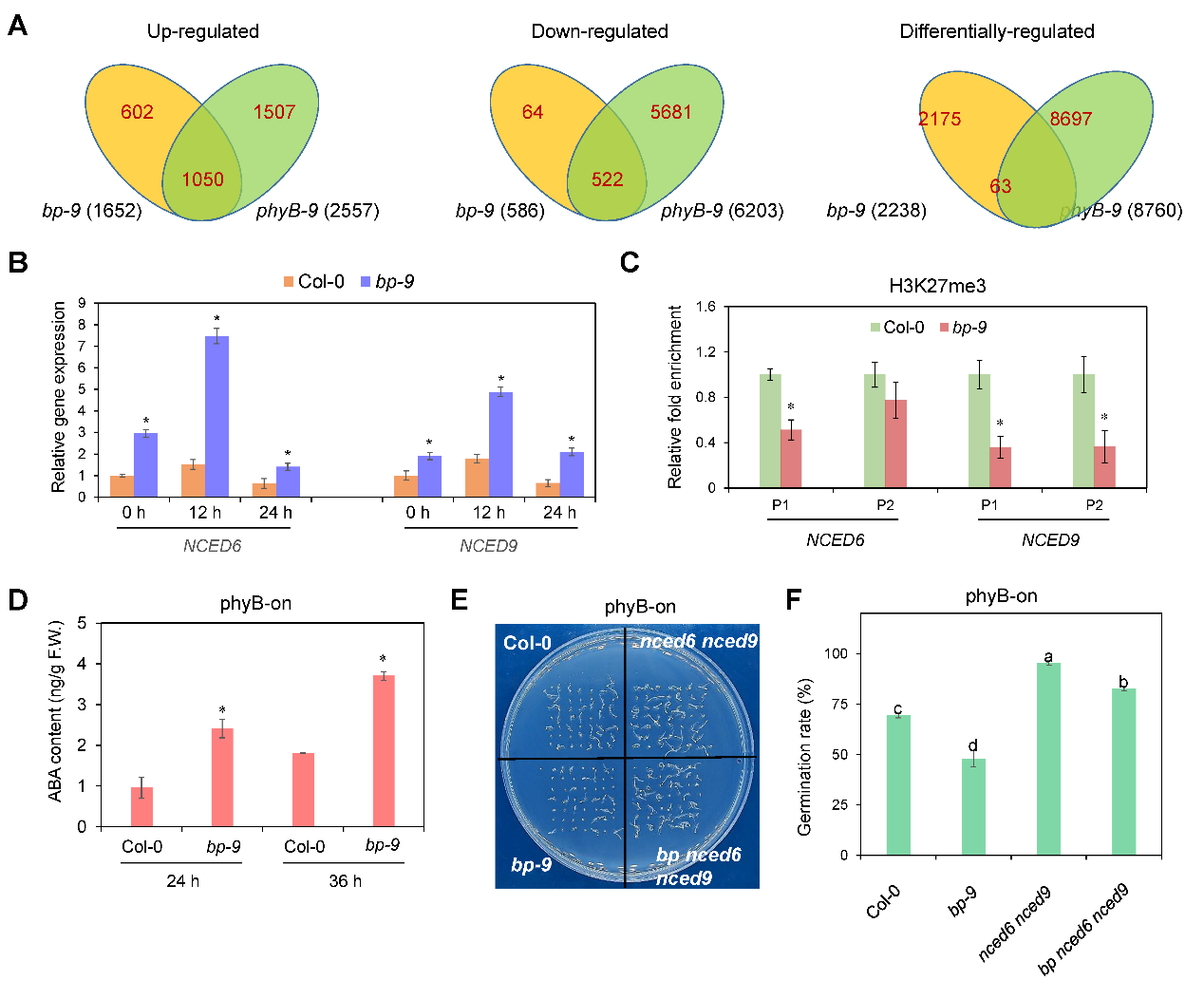 转录组分析显示,在phyB激活条件下,BP与phyB共同抑制萌动种子中ABA的生物合成及其信号转导途径。进一步的转录调控分析表明,BP能够在体内和体外直接结合NCED6/9基因,并通过提高其组蛋白H3K27me3修饰水平以抑制表达;而在phyB缺失背景下,BP对NCED6/9的结合能力及转录抑制效应均显著减弱。ABA含量测定结果发现,在phyB激活时,BP突变体中的ABA含量明显高于野生型,而在phyB失活条件下则无显著差异。遗传分析表明,NCED6/9在遗传上位于BP的下游,参与光调控的种子萌发过程。以上结果说明,在phyB激活的萌发途径中,BP通过增强NCED6/9基因位点的H3K27me3修饰水平抑制其转录,从而减少ABA的生物合成(图3)。