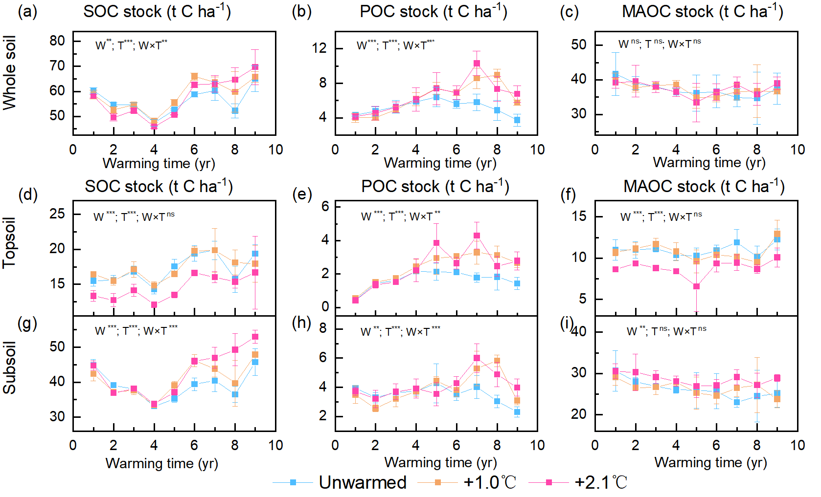 针对这一问题,中国科学院华南植物园鼎湖山站刘菊秀研究员团队于2012年在鼎湖山站建立了野外生态系统水平被动增温实验平台(+0°C、+1.0°C、+2.1°C),开展了长期观测研究。研究发现,土壤不同有机碳组分对增温的响应受增温时间的影响。土壤有机碳对增温的响应呈“两个阶段”(图1、2和3):在第一阶段(1–4年),增温导致土壤有机碳净损失,主要由于增温刺激的植物-微生物养分竞争导致土壤表层矿物结合态有机碳显著减少;在第二阶段(6–9年),由于持续的植物碳输入和微生物碳代谢的热调整使得植物来源的颗粒有机碳显著增加,从而导致土壤有机碳的净积累。这些结果表明,在适度增温下,一些湿润的热带和亚热带森林土壤可能继续积累有机碳,挑战了以往仅基于土壤增温实验而得出的结论:即普遍预测未来变暖会使热带和亚热带森林成为碳源。该研究加深了人们对增温下植物-土壤相互作用如何驱动亚热带森林土壤有机碳长期动态变化的理解。