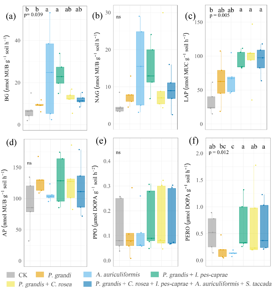 图1. 热带珊瑚岛不同植物种植模式下土壤酶活性