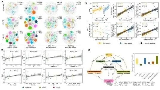 基于此,中国科学院华南植物园鼎湖山站刘菊秀研究员团队基于在鼎湖山建立并连续运行十余年的野外生态系统水平增温平台(+0°C、+1.0°C、+2.1°C),开展了南亚热带森林土壤微生物碳代谢对长期增温的响应与适应机制研究。研究发现,增温10年后,微生物碳利用效率与温度呈正相关,这与以往预期的碳利用效率随温度升高而下降的趋势相反,说明微生物碳代谢在长期增温下发生了调整。这种转变并非由微生物多样性的变化以及底物碳有效性驱动,而是由微生物群落向更稳定的网络结构重组所致(图)。这些网络主要由生长缓慢但高效的微生物(K策略微生物)组成,从而增强了微生物代谢的热适应能力。最终,微生物的呼吸作用和生长恢复到与未升温土壤相当的水平,部分抵消了最初的碳损失。这与先前温带森林中的仅土壤增温实验观测结果不同。