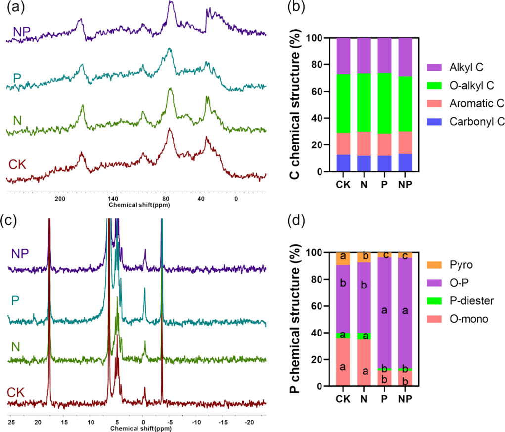 图1. 不同养分添加下热带森林土壤有机碳与磷的化学组成。注:土壤¹³C NMR谱图(a)、碳化学组分(b)、³¹P NMR谱图(c)及磷化学组分(d)。Pyro,焦磷酸盐磷;O-P,正磷酸盐磷;P-diester,磷酸二酯磷;O-mono,磷酸单酯磷。CK,不施肥;N,施氮肥;P,施磷肥;NP,氮磷肥配施。