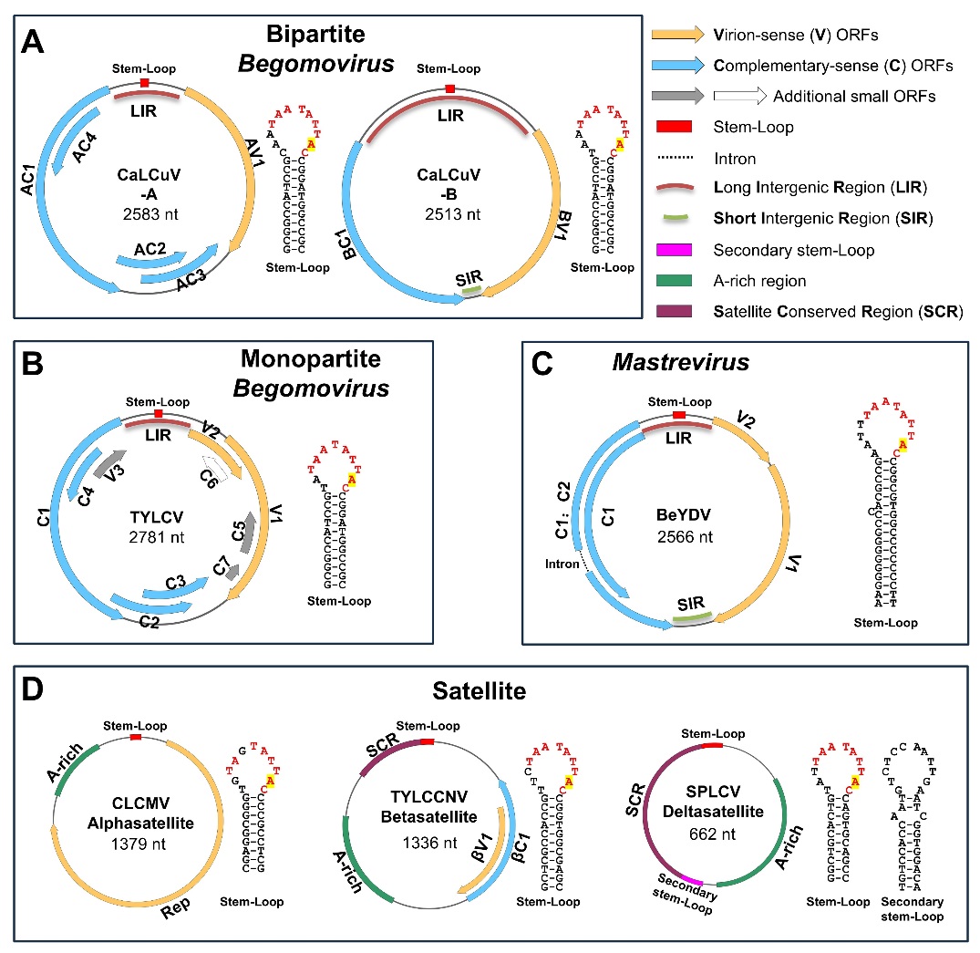 双生病毒基因组以及编码的病毒蛋白包括两大核心关键特征:茎环结构(Stem-loop)和Rep蛋白。病毒复制必需的关键蛋白Rep蛋白可以识别病毒基因组中的茎环结构,起始并完成病毒DNA的滚环复制。通过组装这两个关键的核心组件,可以构建出在宿主细胞中高效自主复制的双生病毒复制子(Geminiviral Replicons, GVRs)。作为VIGS载体,双组分双生病毒,通过替换AV1基因,插入靶标序列;而单组分双生病毒,则需要借助卫星DNA(α/β/δ卫星DNA)构建VIGS载体。在合成生物学领域,GVR依赖其高效自主复制能力,可以显著地提高蛋白质产物的产量以及GRISPR/Gas系统介导的基因编辑效率。此外,双生病毒基因组及卫星DNA中发现的多种基因表达调控元件也丰富了GVR的应用。
