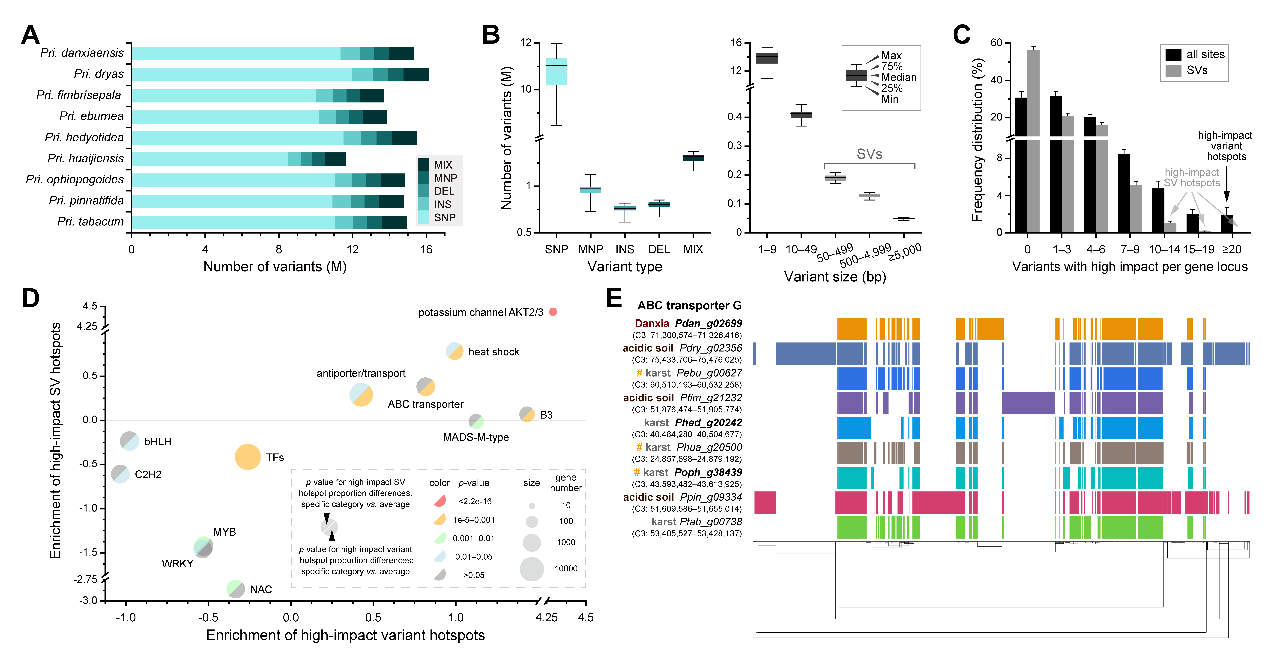 华南植物园泛基因组科研团队研究完成了7个高质量基因组组装,构建了涵盖喀斯特、丹霞及酸性土壤9个物种的报春苣苔属泛基因组,为解析土壤专化适应机制提供了关键基因组学资源。喀斯特适生物种基因组显著小于非喀斯特物种,与其LTR重复元件含量降低相关,符合基因组氮限制假说。两次谱系特异性全基因组加倍(WGD)事件显示,大基因家族呈现重复拷贝倾向于丢失,而转录因子家族成员尽管数量众多却优先保留(图1),暗示适应性与非适应性进化力量的共同作用。泛基因组分析发现,离子通道与转运蛋白基因在变异热点区域显著富集,且在喀斯特谱系中频繁受到正选择,这些候选基因与土壤贫瘠耐受性、抗旱性及肉质叶片的重复进化相关。值得注意的是,位于高影响变异热点区域的ABC转运蛋白G亚家族(ABCG)在喀斯特物种中呈现正选择信号且结构保守,而非喀斯特物种则携带特异的大型插入片段(图2,图3)。综上,基因组缩小、WGD后功能基因的偏向性滞留及离子转运通路适应性进化协同驱动了报春苣苔属植物对特殊土壤生境的适应。本研究为生态基因组学提供了土壤专化与基因组演化关联的新视角。