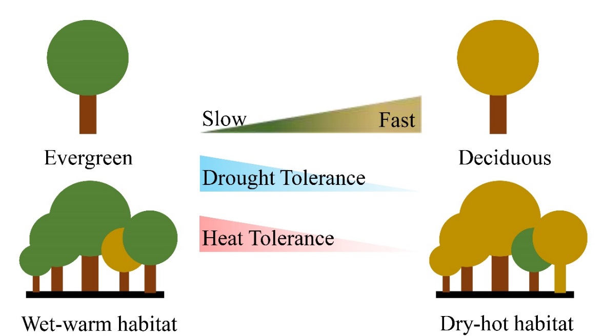 假设:采用“慢速”策略的常绿物种具有更高水平的耐旱性和耐热性,而采用“快速”策略的落叶物种由于其更强的避旱避热能力,则不需要较高的旱热耐受性。因此,随着干热生境中落叶物种比例的提高,其平均旱热耐受性反而可能比湿暖生境中的植物更小。