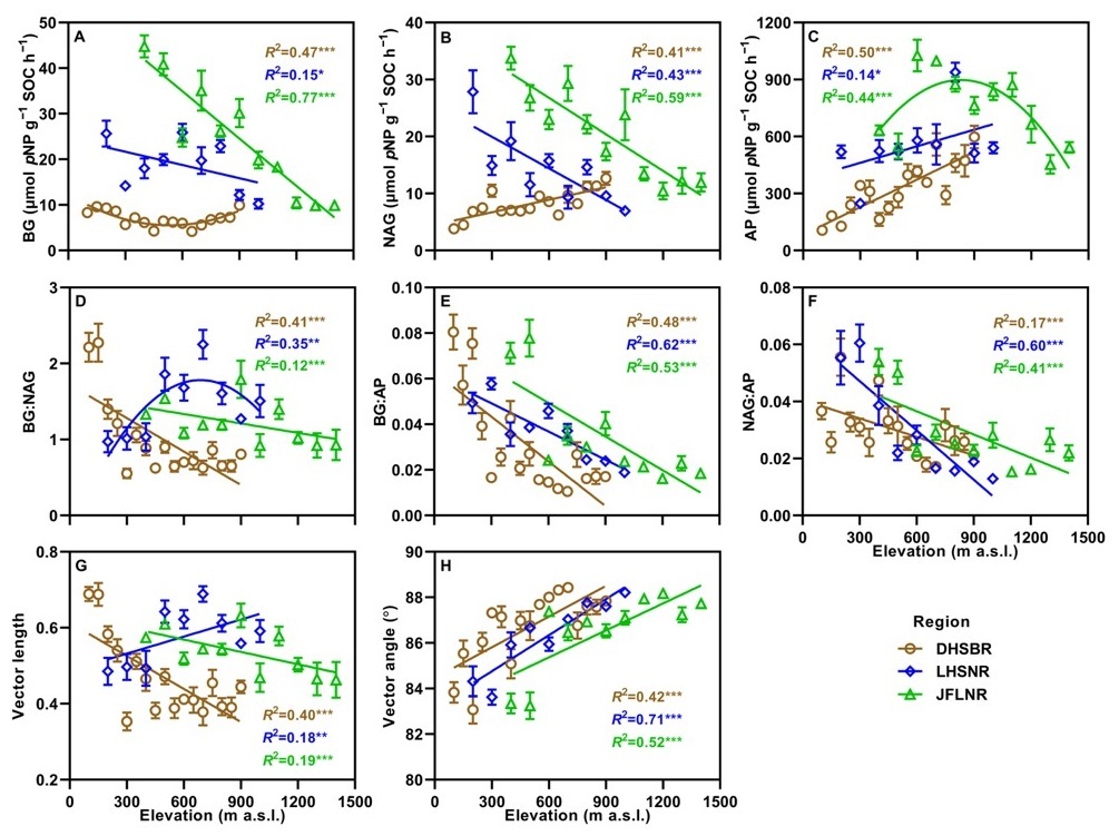 图. 鼎湖山(DHSBR)、莲花山(LHSNR)和尖峰岭(JFLNR)沿海拔梯度的土壤胞外酶活性(A–C)、酶化学计量比(D–F)及微生物养分限制特征(G–H)。数据为平均值 ± 标准误(n = 5)。ns 表示差异不显著;* 表示 p < 0.05;** 表示 p < 0.01;*** 表示 p < 0.001。BG,β-1,4-葡萄糖苷酶;NAG,β-N-乙酰葡萄糖胺苷酶;AP,酸性磷酸酶。向量长度表示微生物碳限制程度,向量角度表示微生物氮或磷限制。