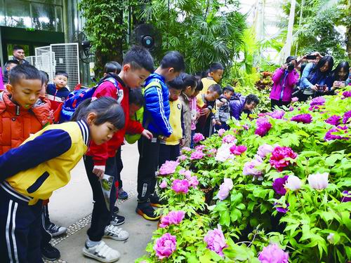 1月17日,一群小朋友在华南植物园欣赏展览前的牡丹。朱汉斌摄