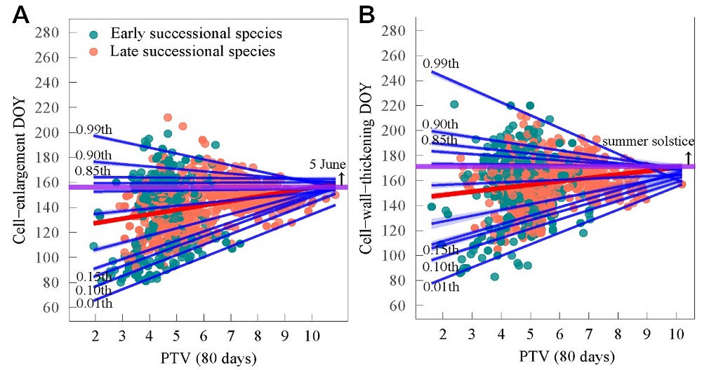 图1. 随着温度波动(PTV)增大木质部细胞倾向于在一年中的6月5号开始增大(A),而在夏至日开始细胞壁增厚(B)