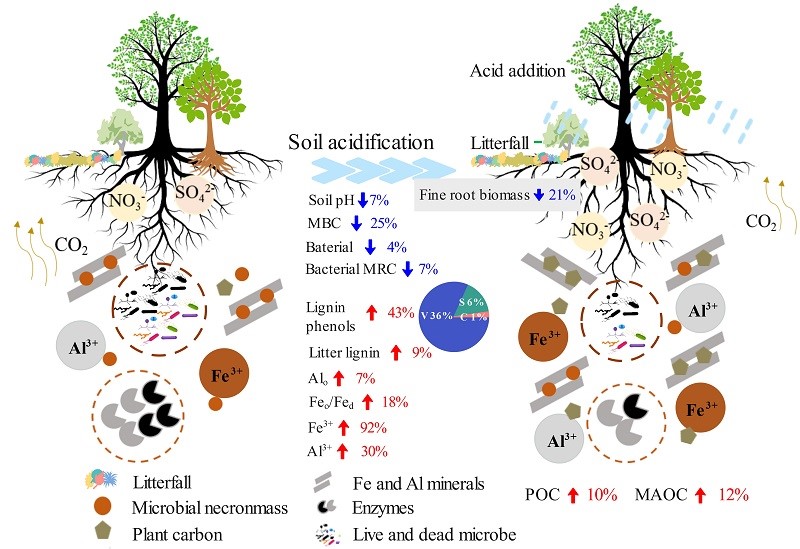 该研究强调了森林土壤酸化促进了矿质保护机制和植物源碳的累积。该发现从机理上支撑了深度酸化森林土壤持续固碳增汇的功能。